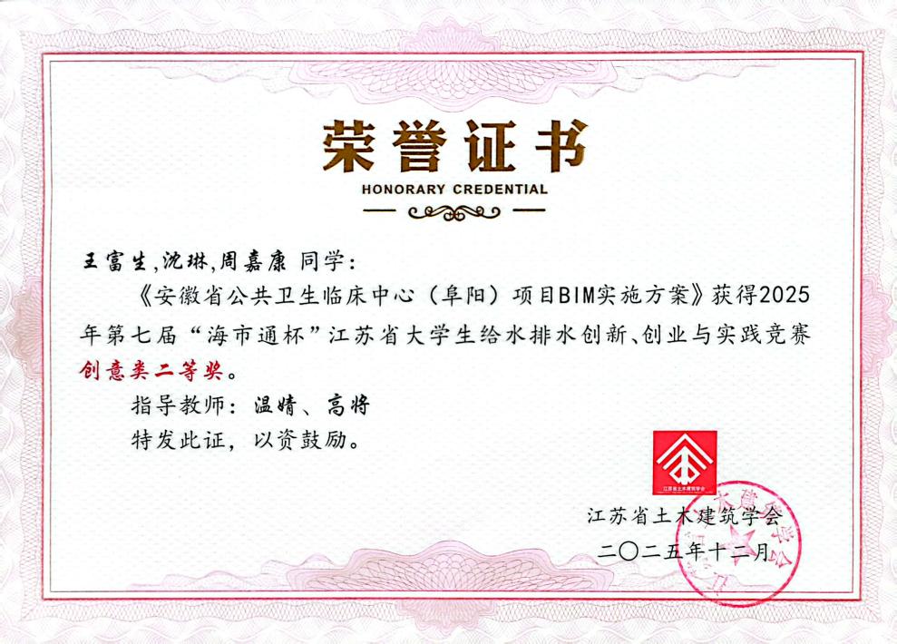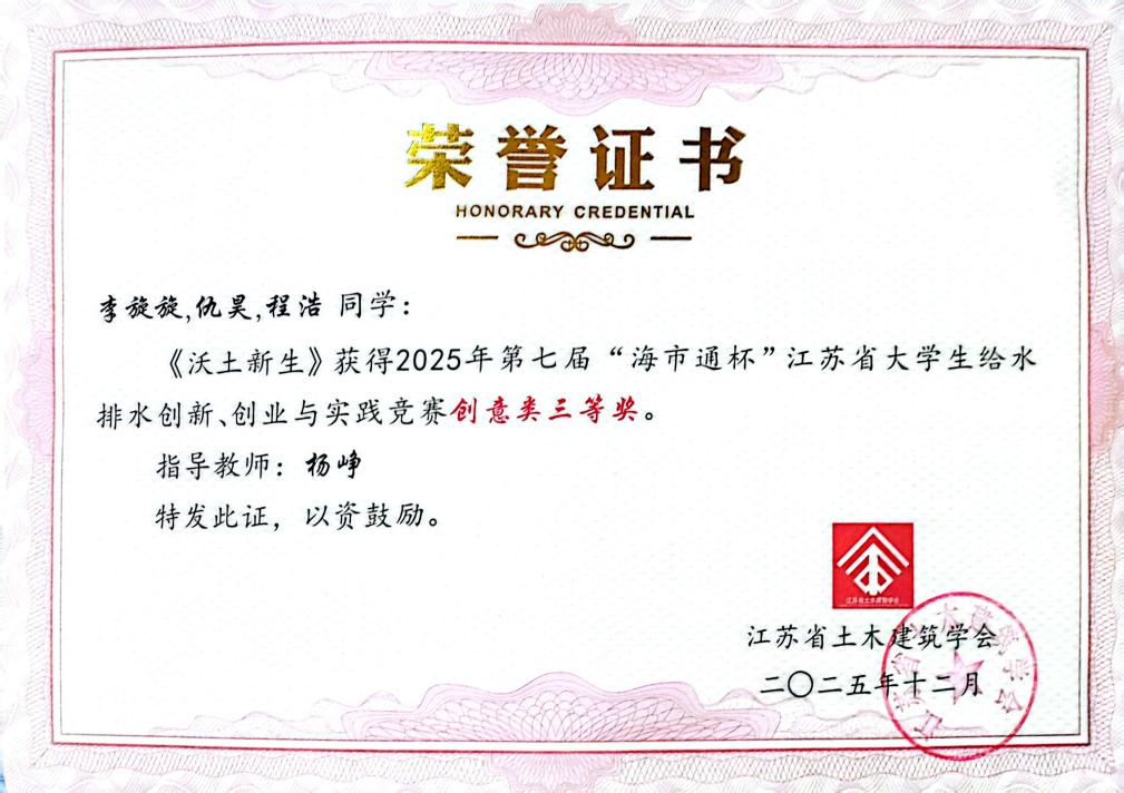 2025年城镇给水排水新技术交流会暨江苏省给水排水学术交流年会于12月3-5日在镇江成功举办。大会公布了2025第七届“海市通杯”江苏省大学生给排水创新、创业与实践竞赛评审结果并召开了颁奖仪式。我校学生王富生、沈琳等同学荣获创意类二等奖,李旋旋、仇昊等同学荣获创意类三等奖。