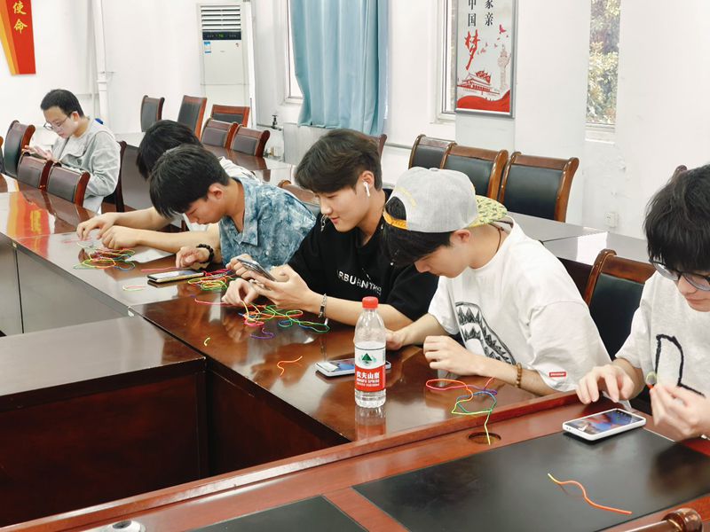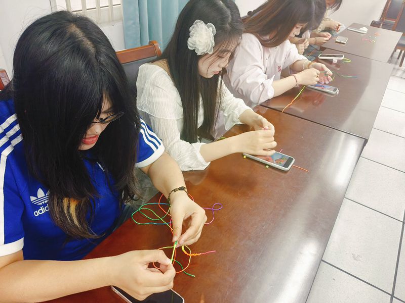 在30分钟的自由编织环节,同学们兴致勃勃地挑选各色丝线,发挥创意搭配色彩,尝试不同编织方法,不少同学还巧妙加入小配饰,打造出独具个性的五彩绳作品。动手能力较弱的同学在志愿者的耐心指导下,也顺利完成了自己的作品,脸上洋溢着成就感。