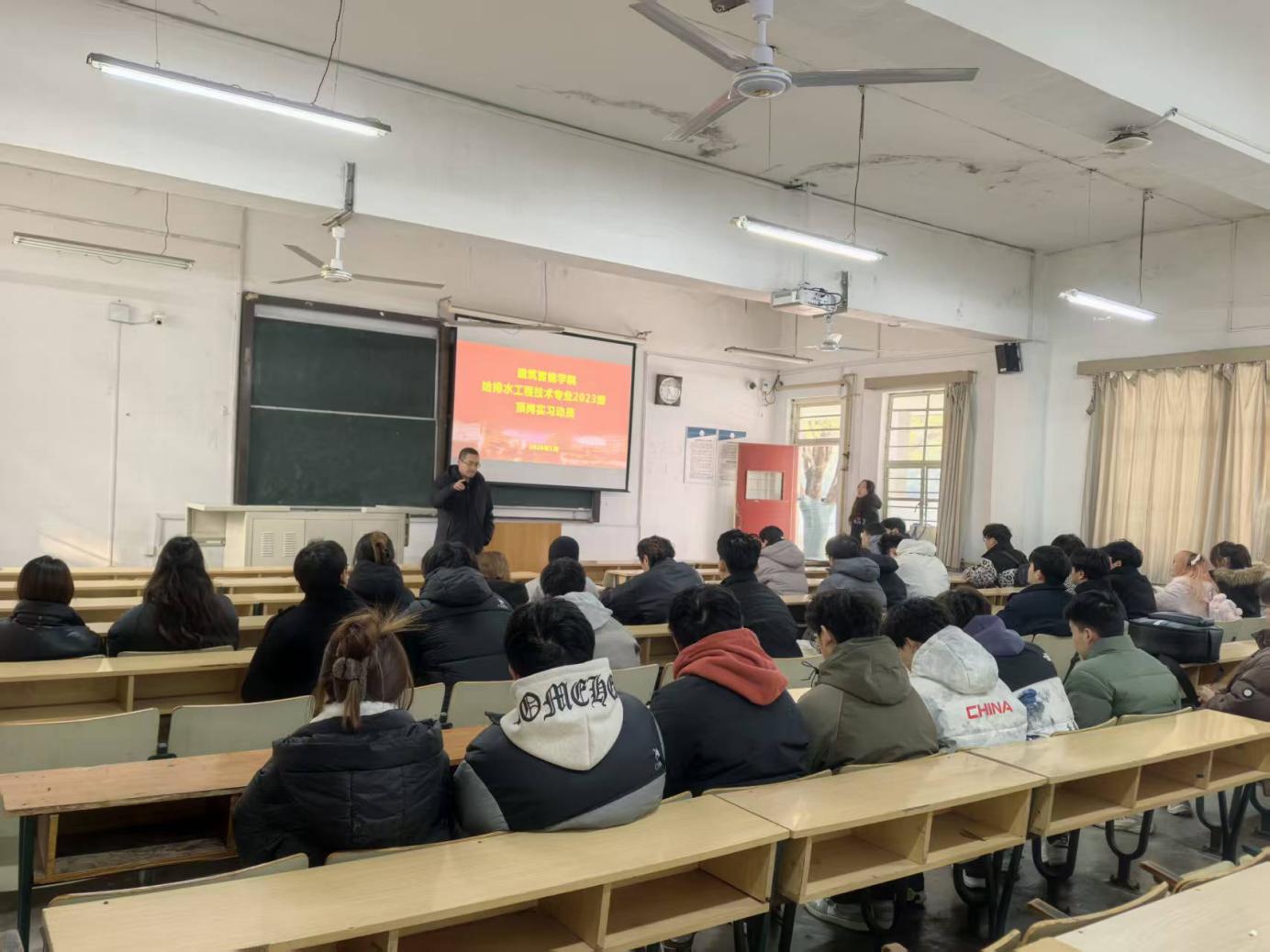 2026年1月6日下午,给排水工程技术专业在教一楼143教室召开了2023级顶岗实习动员大会,给排水工程技术专业全体教师和2023级全体学生参加了此次会议。